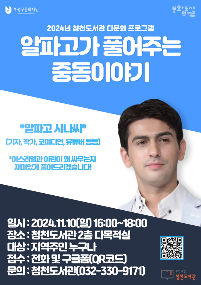 [인천=문찬식 기자] 인천 부평구 구립 청천도서관은 오는 11월10일 다문화 프로그램 ‘알파고가 풀어주는 중동이야기’를 진행한다.