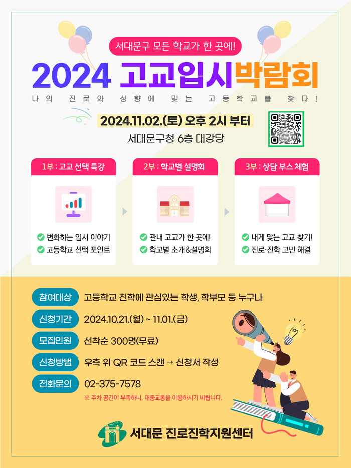[시민일보 = 이대우 기자] 서울 서대문구(구청장 이성헌)가 오는 11월2일 오후 2~5시 구청 6층 대강당에서 ‘2024년 고교입시 박람회’를 개최한다.