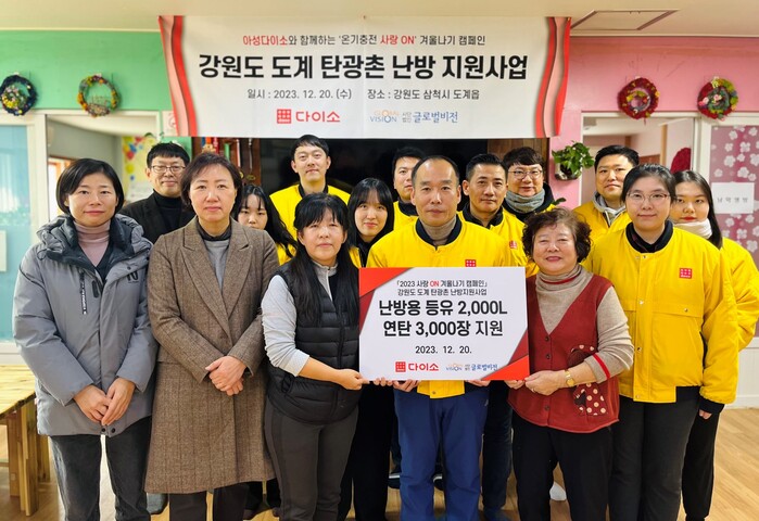 아성다이소에 따르면 이번 캠페인을 통해 아성다이소 임직원은 직접 도계 탄광촌 지역을 방문해 도계지역 가정과 아동센터에 연탄 3000장과 등유 2000L를 전달했다.