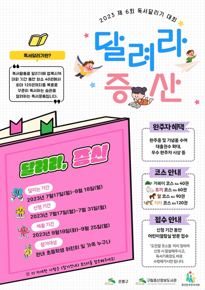 [시민일보 = 이대우 기자]서울 은평구(구청장 김미경)는 구립증산정보도서관에서 독서 습관을 장려하기 위한 ‘2023년 제6회 독서달리기 대회 <달려라, 증산!>’을 오는 17일부터 9월 18일까지 진행한다고 밝혔다.