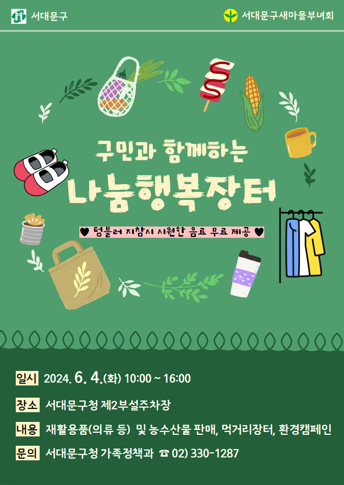 [시민일보 = 변은선 기자] 서울 서대문구(구청장 이성헌)가 지속가능한 자원 순환과 지역 내 나눔문화 확산을 위해 6월4일 오전 10시~오후 4시 서대문 홍제폭포 광장에서 ‘나눔행복장터’를 개최한다.