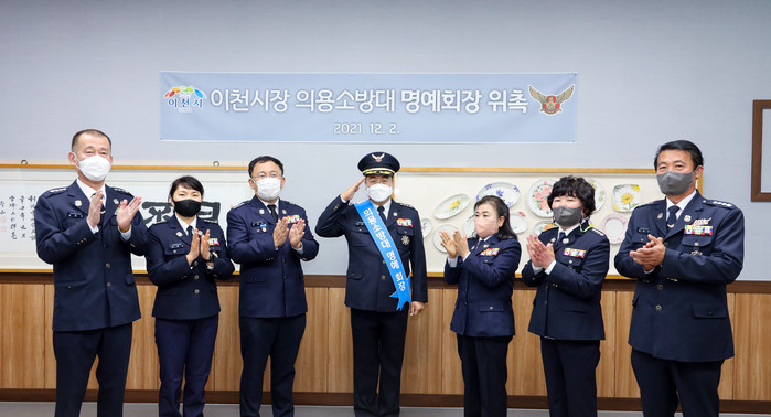 경기 이천시 의용소방대연합회가 올해 ‘의용소방대의 날’ 제정을 기념해 2일 엄태준 시장을 의용소방대 명예회장으로 위촉했다. 사진은 위촉식에서 엄 시장(가운데) 의용소방대 정복을 입고 거수경례를 하고 있는 모습. (사진제공=이천시청)
