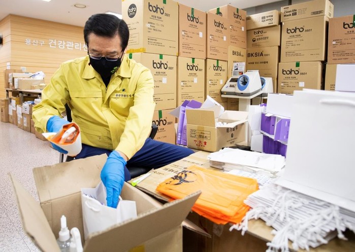 성장현 용산구청장이 최근 구 종합행정타운 선별진료소내 마련된 신속항원검사장을 방문해 현장 운영실태를 살피고 근무자를 격려했다. 사진은 재택치료자 배부용 키트를 포장하고 있는 성장현 구청장의 모습. (사진제공=용산구청)