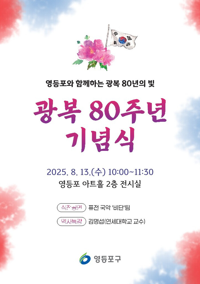 공식 기념식은 오는 13일 오전 10시, 영등포 아트홀 전시실에서 개최한다. 식전공연을 시작으로 ▲광복 80주년 기념영상 상영 ▲감사장 전달 ▲명사초청 특강 등이 진행돼, 참석자들에게 뜻깊은 시간을 선사할 예정이다.