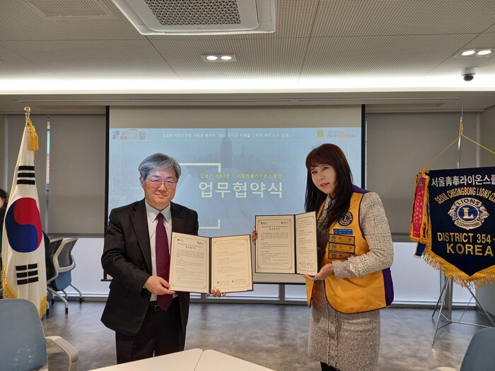 | ▲ 업무협약서를 들고 기념촬영 중인 김태환 개포4동장(왼쪽)과 서울청봉라이온스클럽 김수진 회장 (사진=강남구청 제공) |