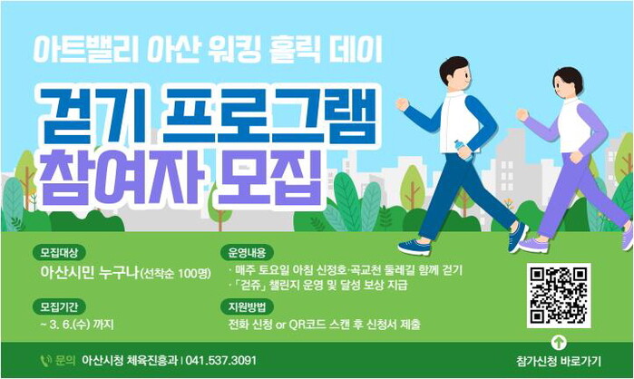 [아산=박명수 기자] 충남 아산시가 건강 걷기 활성화를 위해 ‘아트밸리 아산 워킹 홀릭 데이 걷기 프로그램’과 ‘올바른 건강 참여자 걷기동아리’에 참여할 시민을 모집한다.