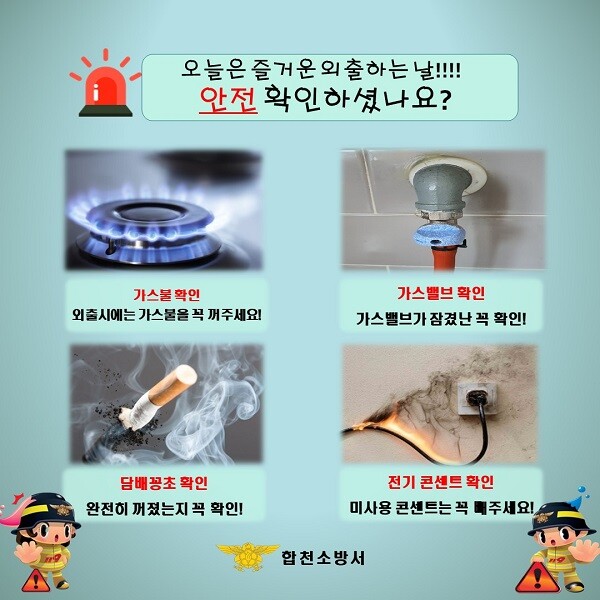 이에 소방서는 ▲담배꽁초는 불씨 제거 후 지정된 장소에 버리기 ▲촛불·향초는 받침대 고정하기 ▲음식물 조리시 자리 비우지 않기▲음식물 조리 후 가스밸브 잠그기 ▲사용하지 않는 콘센트는 빼두기 등 안전수칙 준수를 당부하고 있다.