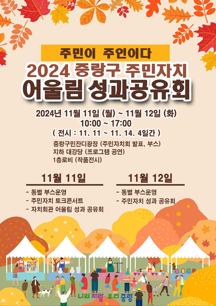 [시민일보 = 여영준 기자] 중랑구(구청장 류경기)가 11일부터 12일까지 이틀간 구청 잔디광장 및 1층 로비, 지하 대강당에서 ‘중랑구 주민자치 어울림 성과공유회’를 개최한다.