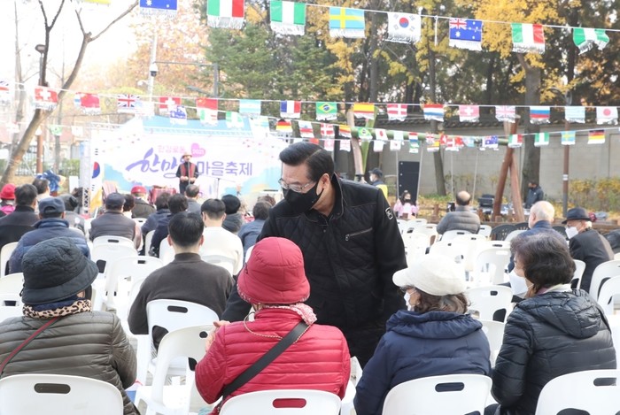 성장현 용산구청장이 최근 주민 화합과 소통을 위해 마련된 ‘제4회 한강로동 한마음 마을축제’에 참석했다. 이날 행사는 한강로동 주민자치회가 주관해 코로나19로 지친 주민들을 위해 다양한 문화체험 공연을 준비했다. 사진은 한마음 마을축제에서 성 구청장(가운데)이 주민들과 인사를 나누고 있는 모습. (사진제공=용산구청)