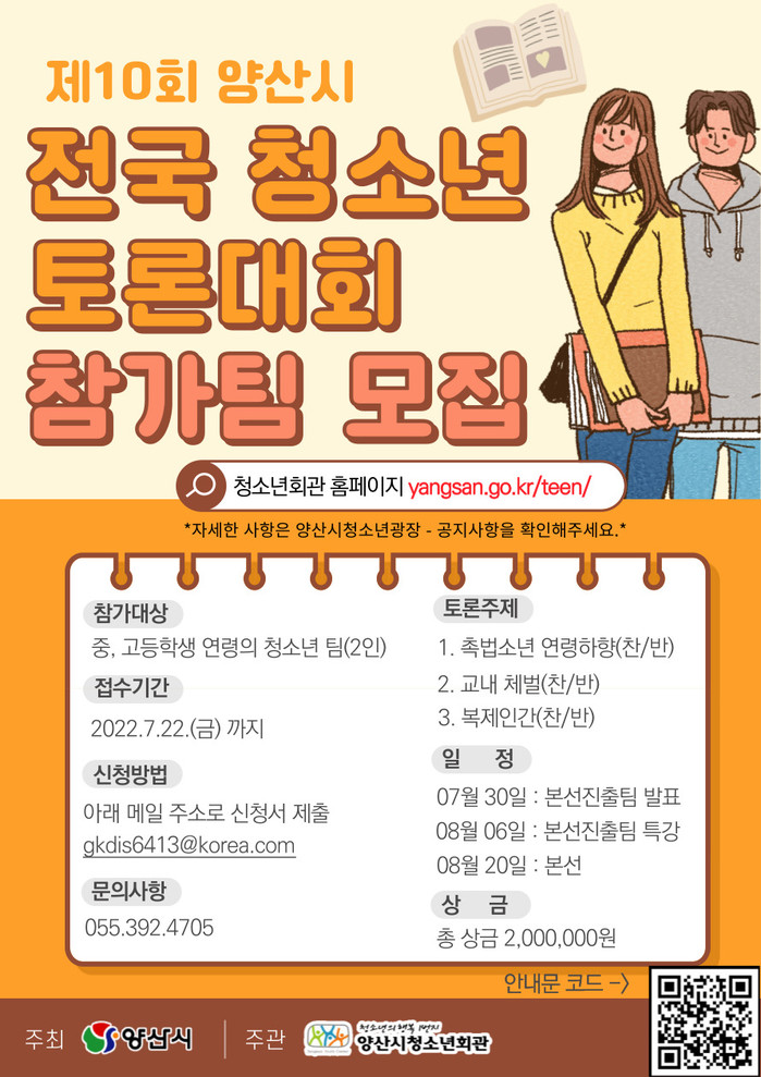 제10회 양산전국청소년토론대회가 양산시 주최, 양산시청소년회관 주관으로 8월 20일(토)에 개최된다.