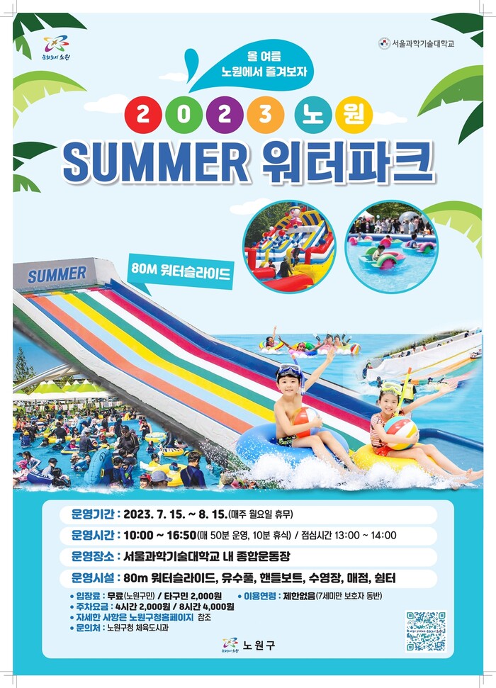 추가 개장하는 물놀이장 가운데 특히 '노원 워터파크'는 서울과학기술대학교 운동장 9000㎡에 인조잔디를 깔고 ▲야외수영장(3조) ▲물썰매장, 유수풀, 에어슬라이드(2조) ▲핸들보트(10대) 등을 구비했다.