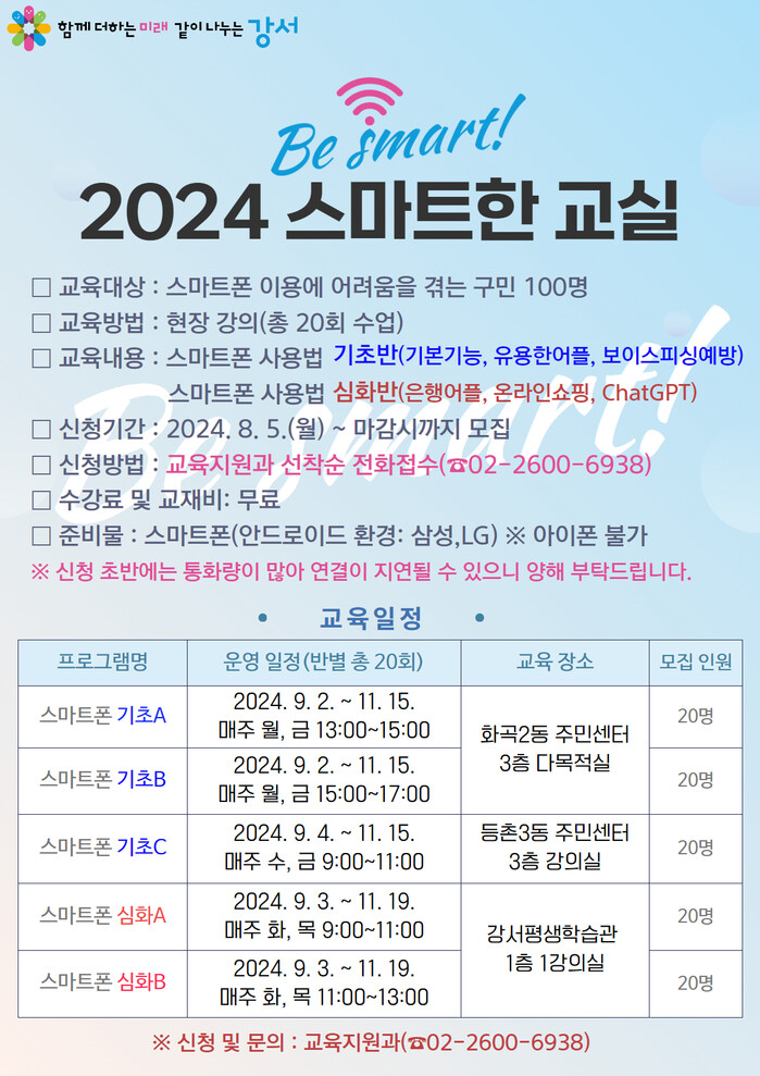 [시민일보 = 이대우 기자] 서울 강서구(구청장 진교훈)가 스마트폰 이용에 어려움을 겪는 중장년층을 위한 ‘강서 스마트한교실’을 운영한다.