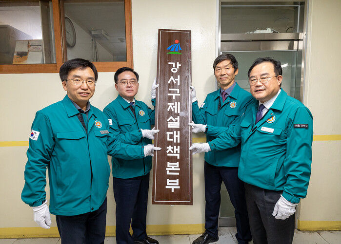 | ▲ 진교훈 서울 강서구청장(왼쪽 두 번째)이 15일(금) 오전 구청에서 제설대책본부 현판식을 진행하고 있다. (사진=강서구청 제공) |