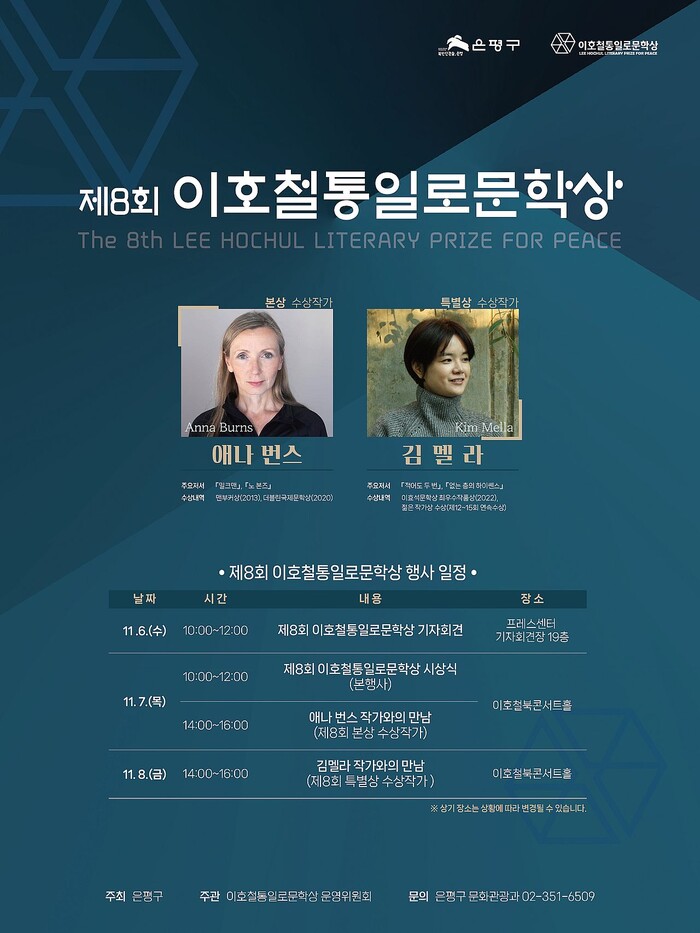 기자회견은 내달 6일 오전 10시 한국프레스센터 19층 기자회견장에서 연다. 시상식은 다음 날 11월 7일 오전 10시 이호철북콘서트홀에서 개최하며, 오후 2시 ‘본상 수상작가와의 만남’의 시간을 마련했다. 부대행사는 11월 8일 오후 2시 ‘특별상 작가와의 만남’을 진행한다. 행사 관련 궁금한 사항은 은평구청 문화관광과로 문의하면 된다.
