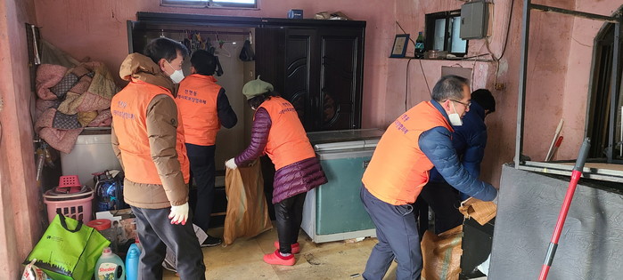 경기 하남시 천현동 지역사회보장협의체가 최근 뇌병변장애를 가진 2명의 딸과 거동이 불편한 어머니 셋이 살아가는 장애인가정을 방문해 수십년간 방치된 쓰레기 수거 봉사활동을 했다. 사진은 봉사자들이 집안에 적치된 폐가구·폐기물 등을 치우고 있는 모습. (사진제공=하남시청)