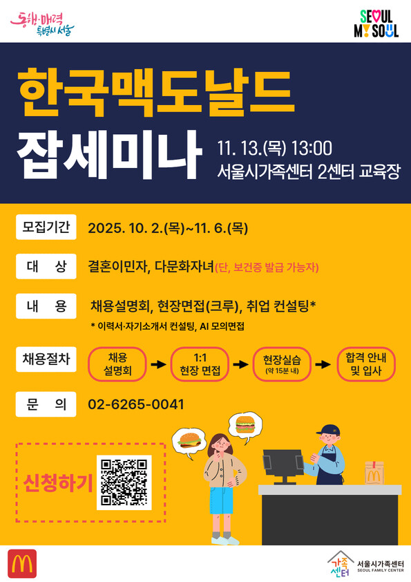 [시민일보 = 문민호 기자] 서울시가족센터는 한국맥도날드와 협력하여 11월 13일(목) 오후 1시 서울시가족센터 2센터에서 결혼이민자와 다문화가족 자녀의 취업 지원을 위한 ‘잡세미나(Job Seminar)’를 추진한다.