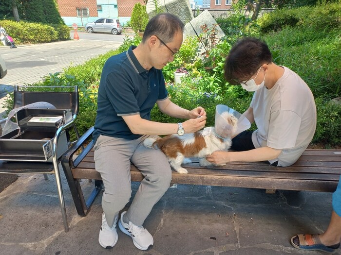 | ▲ 공수의가 ‘찾아가는 동물등록 서비스’ 내장칩 시술을 진행하고 있다. (사진=중구청 제공) |
