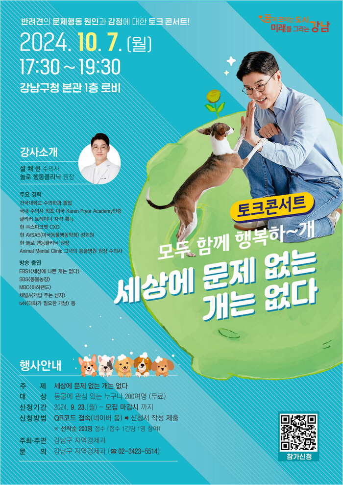 7일 17시 30분부터 19시 30분까지 구청 본관 1층 로비에서 열리는 토크 콘서트는 ‘세상에 문제없는 개는 없다’를 주제로 한다. ‘EBS 세상에 나쁜 개는 없다’에 출연해 반려견 가정이 겪고 있는 문제를 해결해 온 설채현 수의사가 반려견의 문제 행동 원인과 감정에 대해 알려준다. 강의 후에는 질의응답 시간을 마련해, 참석자들이 자신의 반려견 문제에 대해 직접 질문할 수 있다.