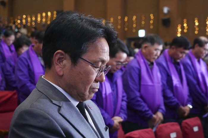 [광주=정찬남 기자] 강기정 광주광역시장이 29일 오전 서울 여의도 국회에서 열린 10·29 이태원참사 2주기 국회 추모제에 참석해 묵념하고 있다./광주광역시 제공