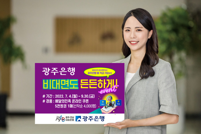 [시민일보 = 이대우 기자] 광주은행(은행장 송종욱)은 오는 7월 4일부터 9월 30일까지 ‘비대면도 든든하게’ 이벤트를 실시한다고 밝혔다.
