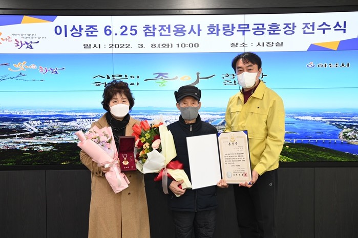 경기 하남시는 지난 8일 6.25전쟁에 참전해 무공을 세운 이상준 전 중위(94)에게 72년 만에 ‘6.25참전자 무공훈장 찾아주기 사업’을 통해 화랑무공훈장과 훈장증을 전수했다. 사진은 김상호 시장(오른쪽)이 훈장을 수여한 뒤 기념촬영을 하고 있는 모습. (사진제공=하남시청)