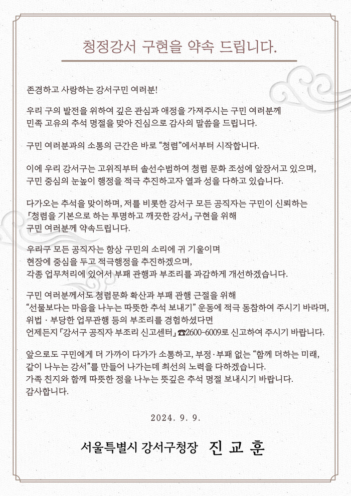 [시민일보 = 박소진 기자] 서울 강서구(구청장 진교훈)가 추석 명절을 맞아 청렴한 공직 분위기 조성을 위해 오는 23일까지 2주간 청렴 집중 홍보주간을 운영한다.