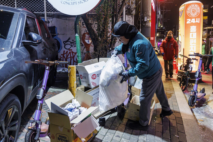 | ▲ 박강수 마포구청장이 레드로드 보도에 적치된 쓰레기와 킥보드를 치우고 있다. (사진=마포구청 제공) |