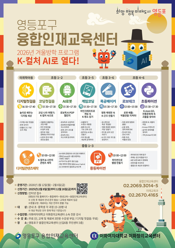 [시민일보 = 여영준 기자] 서울 영등포구(구청장 최호권)는 초등학생과 중학생을 대상으로 ‘융합인재 교육센터 겨울방학 특별 프로그램’ 참여자를 오는 26일까지 모집한다고 밝혔다.