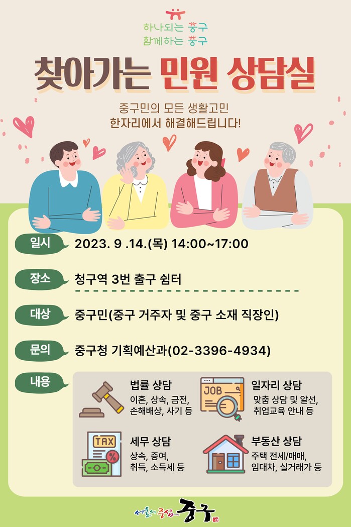 상담은 오는 14일 오후 2~5시 .청구역 3번 출구 쉼터에서 진행된다. 중구민 및 중구에 생활 기반을 둔 누구나 상담받을 수 있다. 사전 예약은 구청 기획예산과로 유선으로 하면 되고 현장 접수도 가능하다. 10월 12일, 11월 2일에도 상담이 진행될 예정이다.