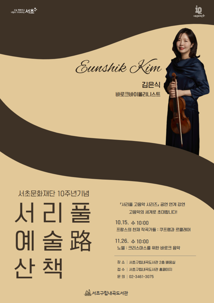 서초구립내곡도서관에서 진행하는 이번 강연은 서초문화재단 문화예술본부와 협력을 통해 ‘서리풀 고음악 시리즈’ 음악 감독 김은식 바로크 바이올리니스트를 초청해 지난 10월 15일 첫 회차를 운영했으며, 오는 11월 26일 한 차례 더 지역 주민들과 만남을 이어갈 예정이다.