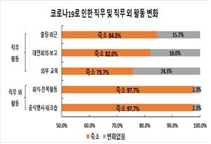 조사에 따르면, 코로나19가 가져온 가장 큰 노동환경 변화에 대해 응답기업의 68.7%가 비대면 중심의 업무방식 꼽았다. 직무활동 중에는 출장.외근(84.3%), 대면회의.보고(82.0%), 외부교육코로나19로 직무수행에 가장 영향을 많이 받은 직군은 영업마케팅 분야