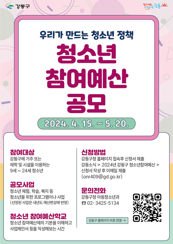 [시민일보 = 이대우 기자] 서울 강동구(이수희 구청장)는 청소년의 반짝이는 아이디어를 구정에 반영하는 ‘청소년 참여예산’ 사업을 5월 20일까지 공모한다고 밝혔다.