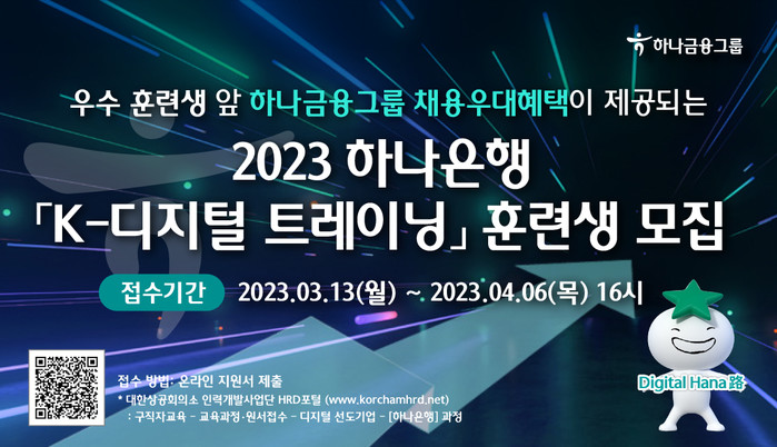 [시민일보 = 여영준 기자] 하나은행은 디지털과 금융의 융복합 시대를 이끌어갈 청년 인재 육성을 위해 고용노동부가 주관하는 'K-디지털 트레이닝'에 참여하고, 13일부터 4월 6일까지 1기 교육생을 모집한다고 밝혔다.