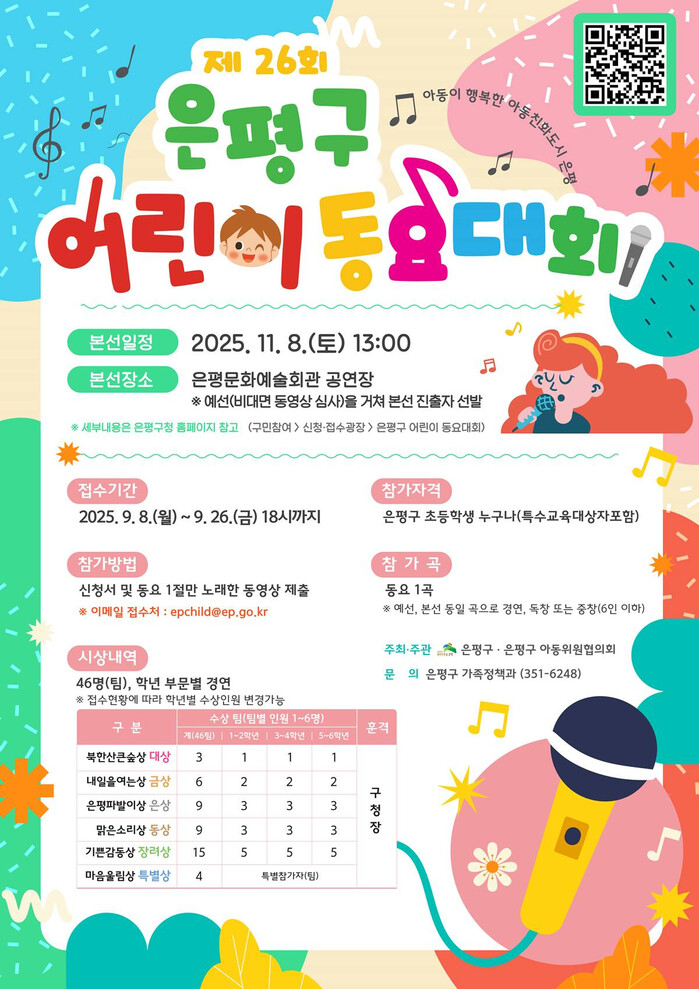 참가는 은평구 초등학생이면 누구나 가능하다. 참가하려면 8일부터 오는 26일까지 신청서, 개인정보 제공 동의서, 동요 1절을 노래한 동영상을 이메일(epchild@ep.go.kr)로 제출하면 된다.