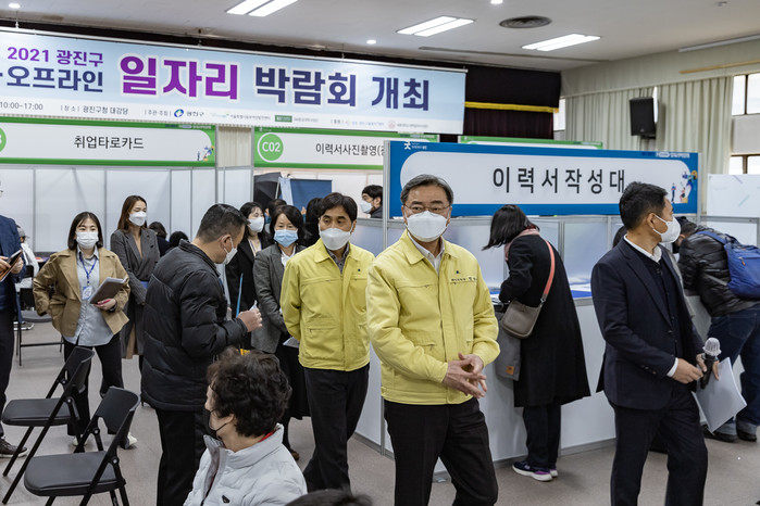 서울 광진구가 최근 ‘2021년 광진구 온·오프라인 일자리 박람회’ 오프라인 현장 박람회를 개최했다. 이날 행사에는 현장면접을 비롯해 여성·중장년층 대상 온라인 취업특강 등 이벤트 부스도 운영됐다. 사진은 이날 박람회를 방문한 김선갑 구청장(오른쪽 두 번째)이 현장을 둘러보고 있는 모습. (사진제공=광진구청)