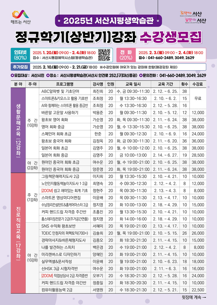 온라인 접수는 서산시 통합예약시스템을 통해 20일부터 2월4일까지, 전화 접수는 2월3~4일 서산시 평생교육과를 통해 할 수 있다.