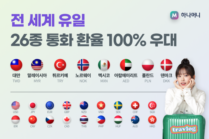 [시민일보 = 여영준 기자] 하나카드는 해외여행 서비스 플랫폼인 트래블로그에서 환율 100% 우대로 환전이 가능한 통화를 총 26종으로 확대한다고 19일 밝혔다.