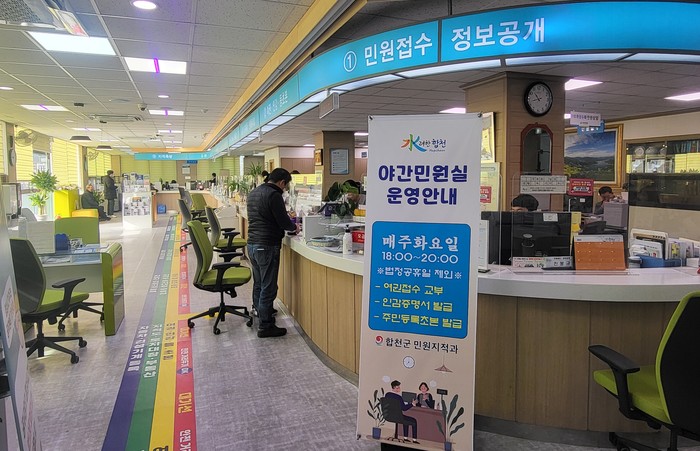 코로나19로 잠정 중단됐던 야간민원실은 2월부터 매주 화요일 오후 6시부터 8시까지 합천군청 1층 민원지적과에서 운영되며 여권과 인감증명서, 주민등록 등·초본을 발급 받을 수 있다.
