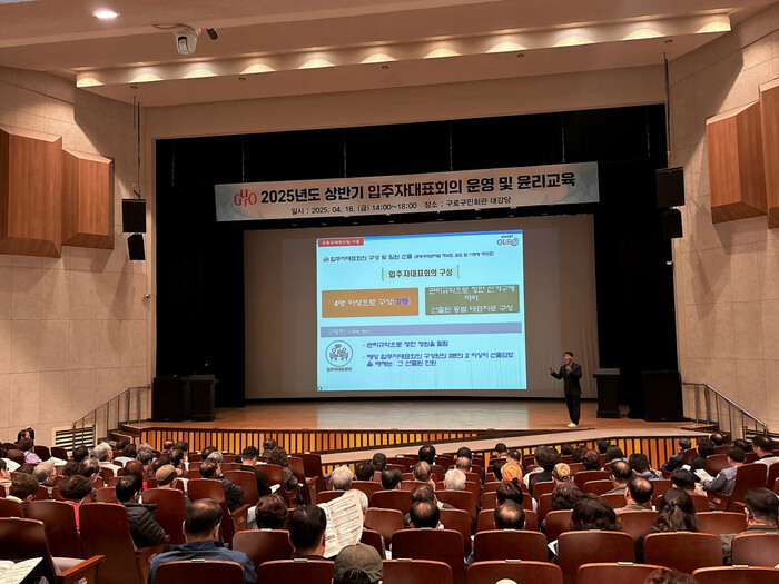 | ▲ 지난 4월18일 구로구민회관 대강당에서 2025년 상반기 입주자대표회의 운영 및 윤리교육이 진행되고 있다. (사진=구로구청 제공) |