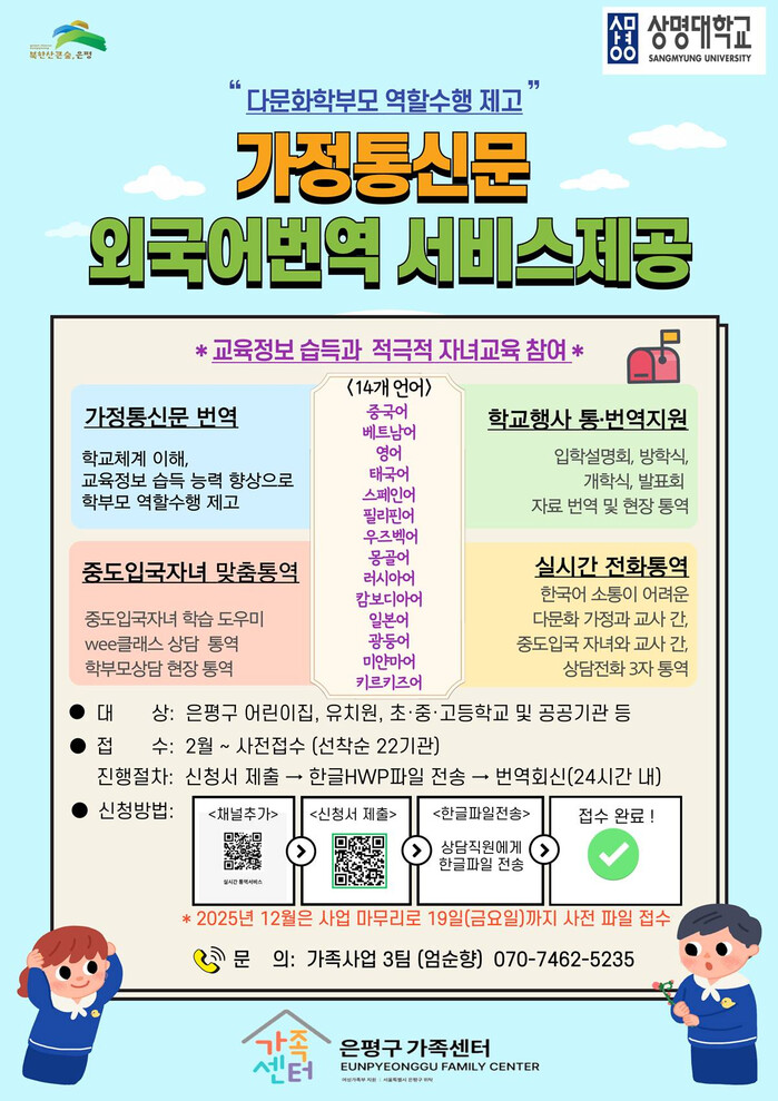 [시민일보 = 이대우 기자] 은평구(구청장 김미경)가 오는 12월까지 외국인 주민을 포함한 관내 다문화 가정을 위해 가정통신문 등 교육 문서에 대한 통번역 서비스를 관내 교육기관을 대상으로 지원한다.