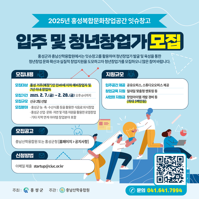 군 관계자는 “창업에 도전하는 청년창업가들이 이번 모집에 적극 참여하여 창업가로서의 역량을 강화하고, 홍성군 경제 활성화에 이바지하는 좋은 기회가 되길 바란다”고 전했다.