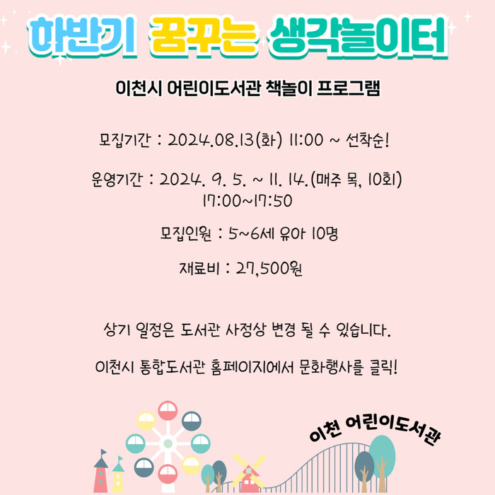 수강 신청은 오는 13일 오전 11시부터 이천시통합도서관 홈페이지를 통해 할 수 있다.