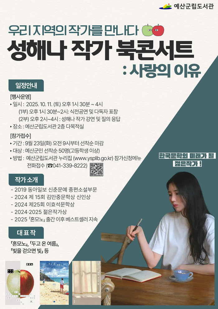 성해나 작가는 예산군 출신 소설가로, 2019년 동아일보 신춘문예 당선으로 데뷔한 후 꾸준한 작품 활동을 이어오며 2024ㆍ2025 문학동네 젊은작가상, 2024 이효석문학상 우수작품상, 2024 김만중문학상 신인상을 수상하는 등 최근 가장 주목받는 작가 중 한 명이다.