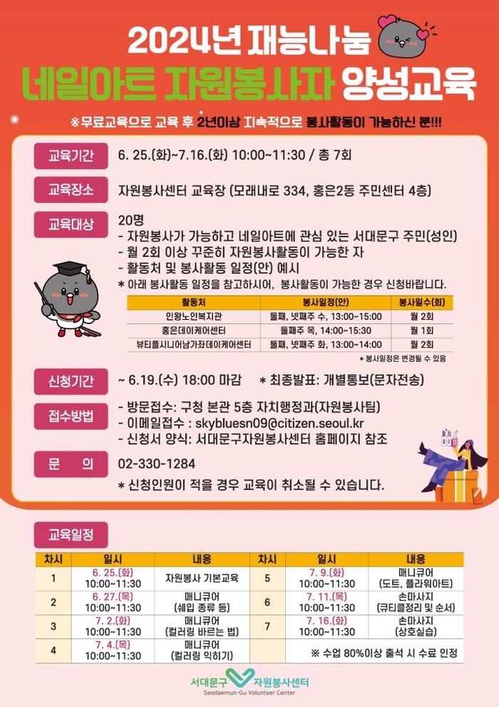 [시민일보 = 변은선 기자] 서울 서대문구자원봉사센터가 봉사 수요 충족과 신규 봉사자 발굴을 위해 ‘2024년 재능나눔 네일아트 자원봉사자 양성교육’을 실시한다.