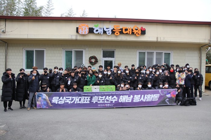| ▲ 해남에서 동계전지훈련을 하고 있는 육상국가대표 후보선수단이 직접 담군 김치를 해남읍 소재 사회복지시설을 찾아 김치를 전달하고 기념촬영을 하고 있다. / 해남군 제공 |