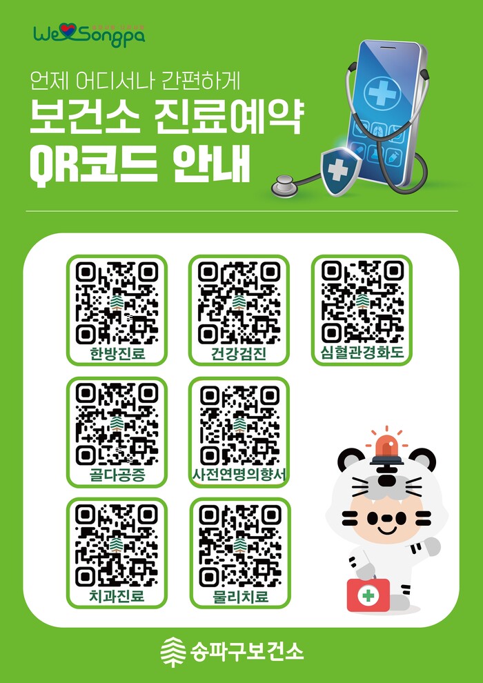 이로써 구민들은 보건소 업무시간에 맞춰 전화·방문하지 않고도 온라인으로 PC나 휴대전화를 활용해 예약할 수 있게 됐다. 특히, 접근성을 강화하고자 QR코드를 통해 7개 진료 분야별 웹페이지에 바로 접속할 수 있게 한 점이 돋보인다.