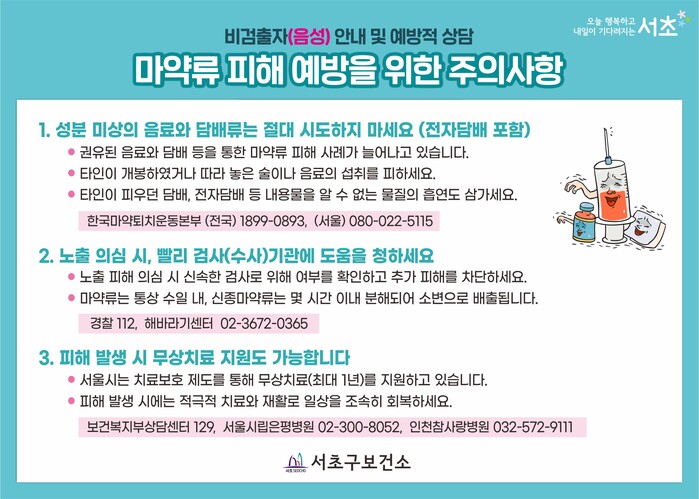 이에 서울 자치구 중 처음으로 자체 제작한 상담 안내문을 활용, 검사결과가 음성인 대상자에게는 ▲마약류 노출피해 예방방법 ▲주의사항 및 상담기관 정보 등을 상세히 안내한다.