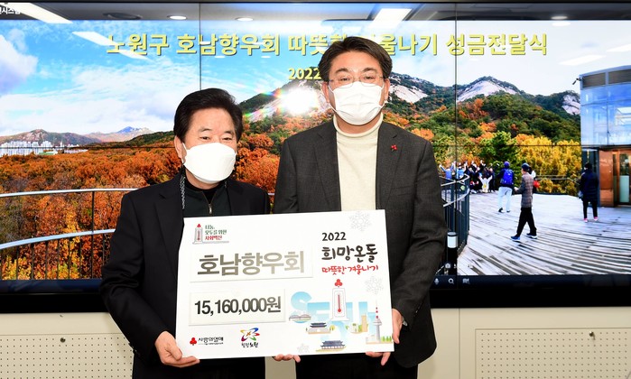 서울 노원구가 18일 호남향우회로부터 어려운 이웃들을 위해 회원들이 모은 성금 1516만원을 전달받는 따뜻한 겨울나기 성금전달식을 진행했다. 사진은 전달식에서 오승록 구청장(오른쪽)이 관계자와 기념촬영을 하는 모습. (사진제공=노원구청)