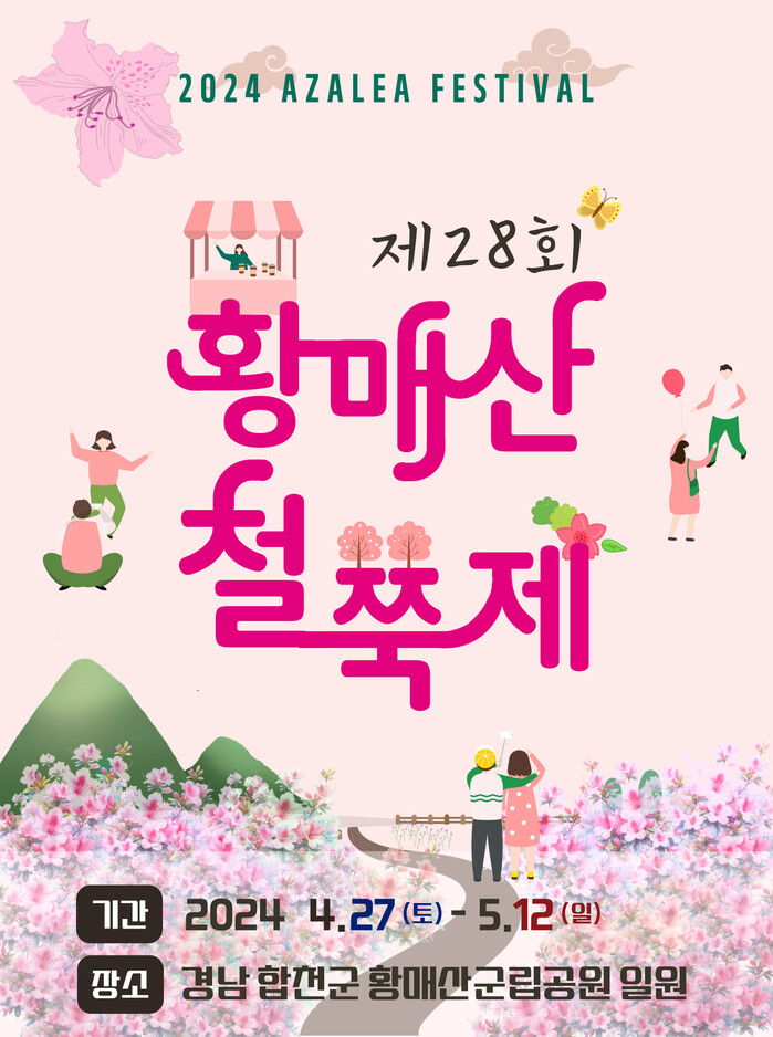 황매산철쭉제는 5월 2일 열리는 제례를 포함해 보물찾기 이벤트, 나눔카트투어, 문화예술공연, 전통놀이체험 등 다양한 프로그램을 준비중이며 합천 지역 농.특산물 판매장 및 먹거리부스(푸드트럭)도 운영될 예정이다.
