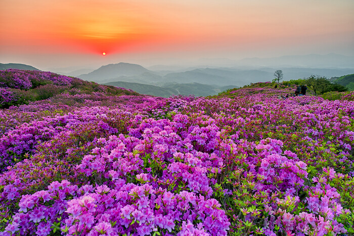 황매산(1,113m)은 철쭉 3대 명산 중 하나로 매년 봄철이면 하늘과 맞닿을 듯 드넓은 진분홍빛 산상화원이 펼쳐진다. 특히 정상아래 해발 800~900m의 드넓은 평원에 철쭉이 만개한 황매산의 풍경은 보는 이들로 하여금 감탄을 자아내며 눈길이 닿는 곳마다 예쁜 꽃망울이 완연한 봄기운을 느낄 수 있게 한다.